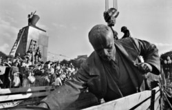 Lithuania took advantage of the Moscow turmoil by banning the Communist Party and arresting its chief. That month, Daraskevicius photographed a Lenin monument (above) in the center of Vilnius being torn down.