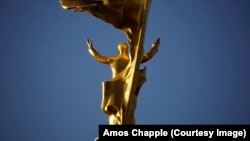 The statue of Niyazov, atop the Monument of Neutrality. The structure was once in central Ashgabat, where the golden statue rotated to always face the sun.