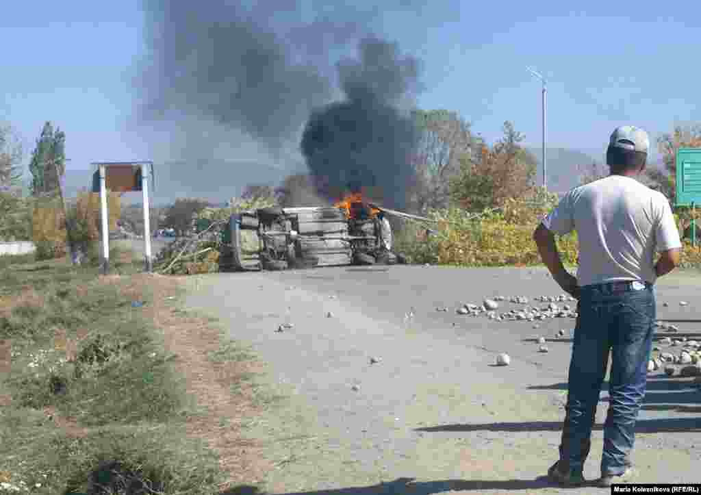 Protesters used trees, cars, and a truck to block the highway in Issyk-Kul Province. Some 400 people were at the site of the roadblock at the height of the protest.