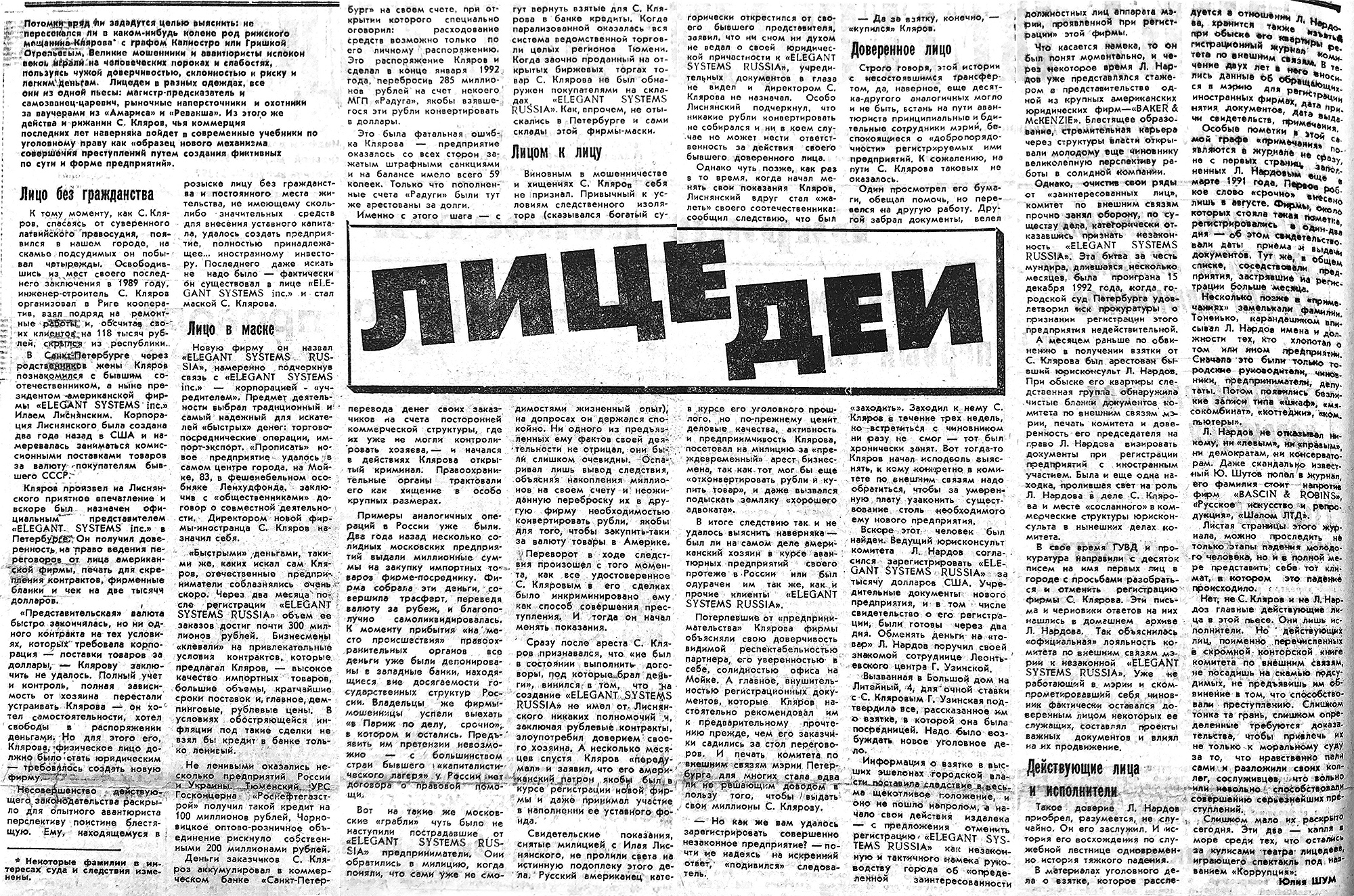 The archive of the St. Petersburg City Court contains information about one more case connected with Elegant Systems Russia. On December 15, 1992, the court heard prosecutors allege that the firm had been registered illegally.