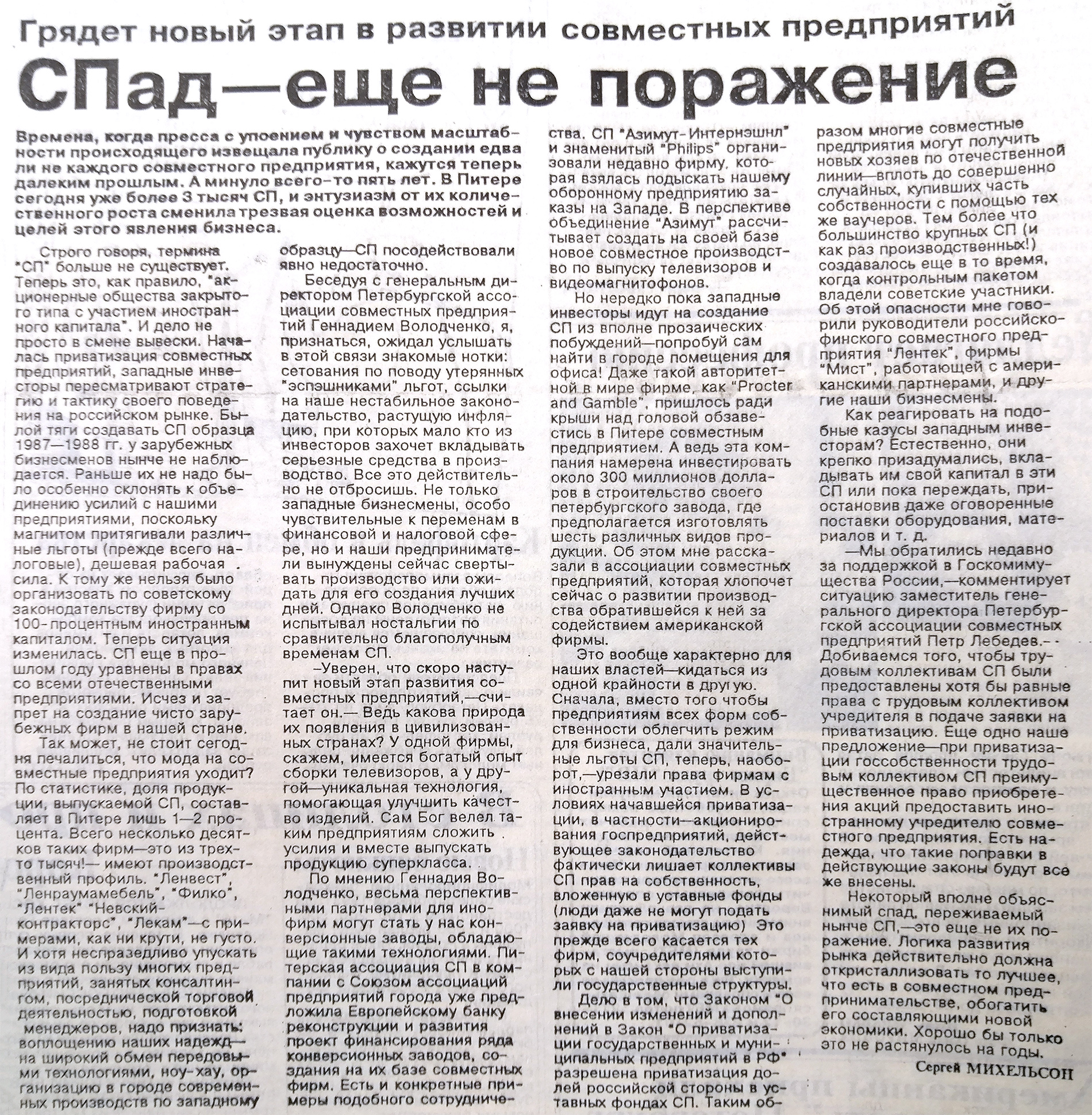 By the end of 1991, nearly 300 joint ventures had been registered in St. Petersburg, according to a KVS report that RFE/RL acquired from the state archives, with an average foreign ownership of 60 percent. In 1993, there were more than 3,000, but they accounted for less than 2 percent of the businesses in the city, the local newspaper Nevskoye vremya reported.