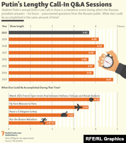Speaking on stage at a desk with two moderators presenting some of the more than 2 million questions submitted by Russians -- many of which are prescreened -- Putin used a large part of the show to concentrate on the pandemic before moving on to questions about inflation, unemployment, education, and infrastructure.