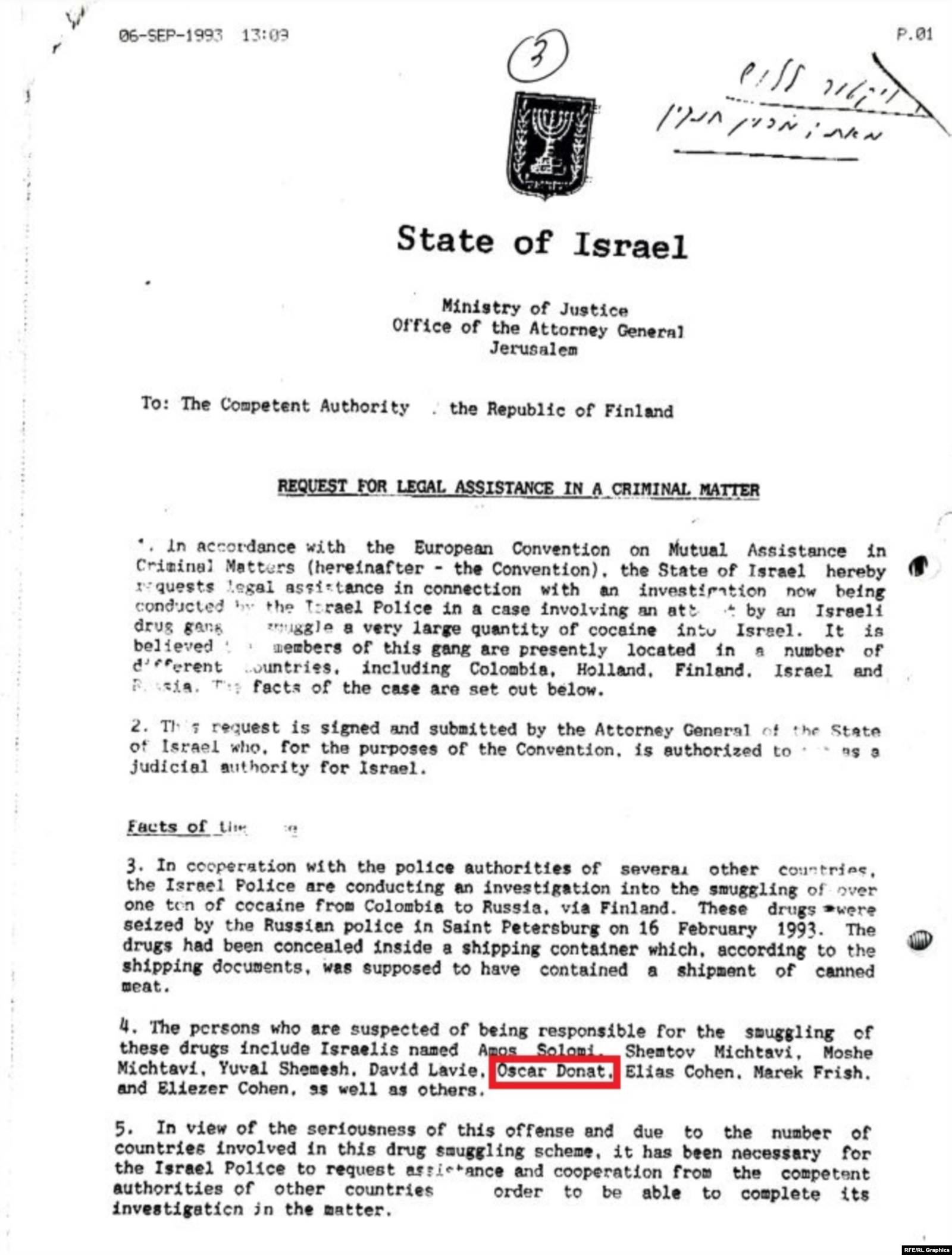 Donat’s name also appears in the request for legal assistance that Israel sent to Finnish authorities in September 1993, identifying the businessman as a “suspect.”