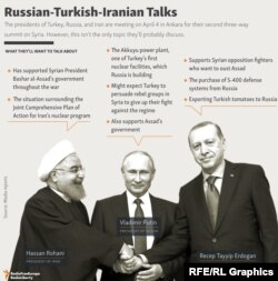 Russian President Vladimir Putin will sit down with Turkish President Recep Tayyip Erdogan and Iranian President Hassan Rohani on April 4 in Ankara for the highest-level talks on Syria's future in five months.