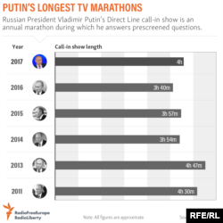 WATCH: Almost every year, Russian President Vladimir Putin sits down in a TV studio for a marathon call-in show during which he takes questions from carefully vetted audience members and prescreened questions from viewers. Here are some of the most fawning questions heard during some of his most recent shows.