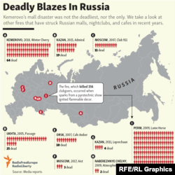 On March 26, the federal Investigative Committee said they found "glaring violations" of safety rules at the mall, such as blocked fire exits, that increased the human toll from the fire in Kemerovo, about 3,000 kilometers east of Moscow.