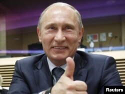 Russian Prime Minister Vladimir Putin gives a thumbs-up at the start of a meeting with the European Commission in Brussels.