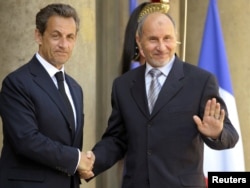 French President Nicolas Sarkozy (left) greets Mustafa Abdel Jalil, head of the main Libyan rebel council, as he arrives for a meeting in Paris.