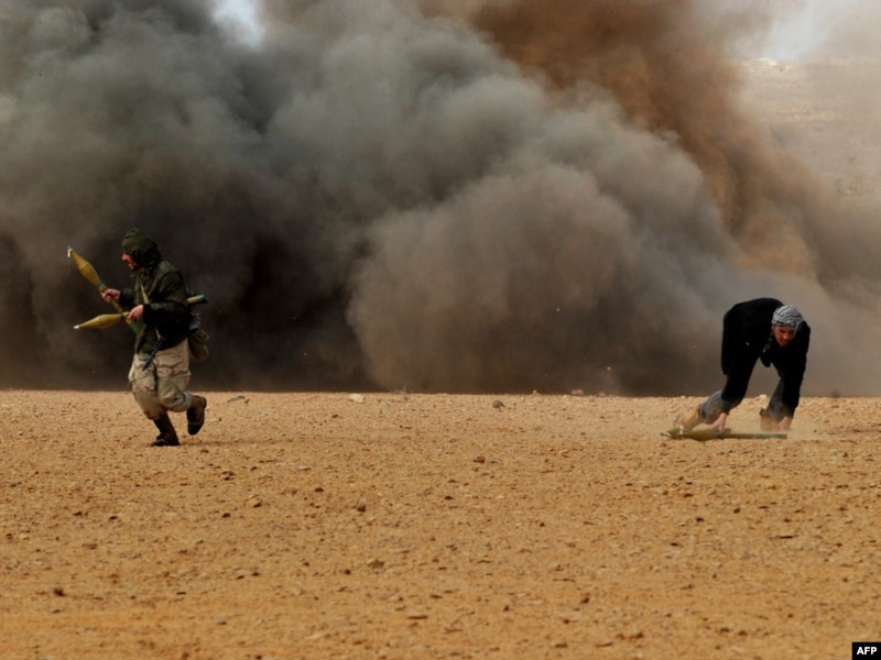 Rebel fighters run for cover as shells explode nearby during a battle today with forces loyal to Qaddafi, just a few kilometers outside the oil town of Ras Lanouf.