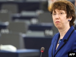 EU foreign policy chief Catherine Ashton delivers a speech during a debate about Libya.