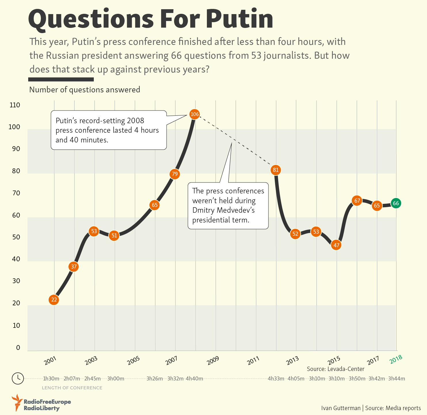 This year, Putin's press conference finished after less than four hours, with the Russian president answering 66 questions from 53 journalists. How does that stack up against previous years?
