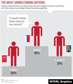 Russia, with 61 percent of participants saying they would refuse refugees entry into the country, was the most unwelcoming country surveyed.