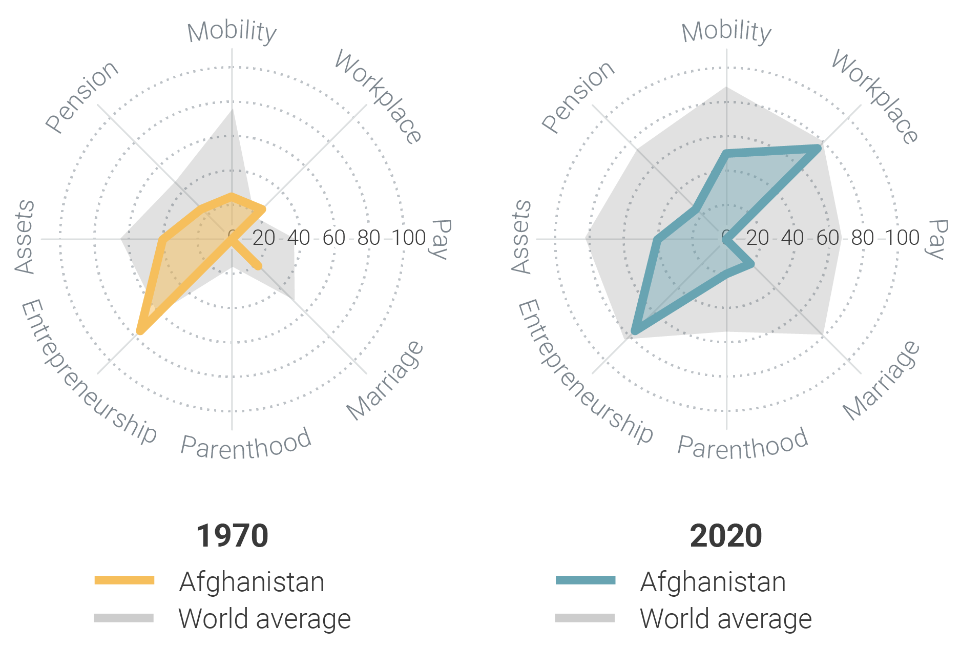 Afghanistan is currently below the global average in all indicators measured. For example, there is still no law that would ban gender-based discrimination at work and no legislation addressing domestic violence. Afghanistan is also one of 15 countries in the world that don't allow women to travel outside their homes in the same way as men.