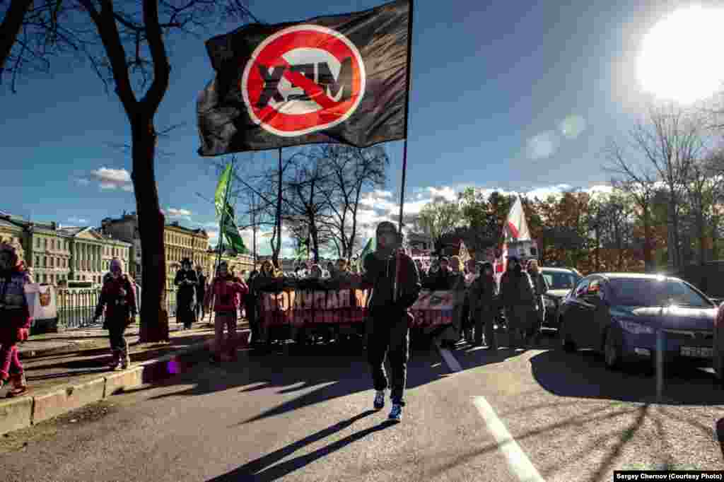 The rally in St. Petersburg on October 20 was one of a series of protests organized by the group Vita last month. They spanned 46 cities, from Vladivostok in the Far East to Stavropol in the south to Belgorod in the west.
