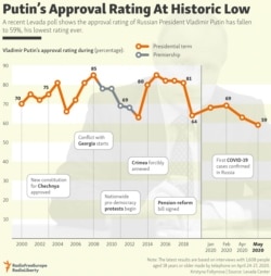 A May 6 poll by the independent Levada Center put support for Putin at 59 percent in April, down from 63 percent the previous month. It was the lowest recorded approval rating for Putin since September 1999.
