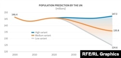 United Nations forecasts for Russia are even a bit more dire. The "optimistic" variant puts Russia's population at 147.3 million in 2050. The conservative estimate is 135.8 million, while the pessimistic prediction foresees a population of 124.6 million by the middle of this century. The UN projected that pessimistic prediction even further, saying it is possible Russia's population could be just 83.7 million by 2100.