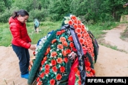 The tombstone is barely visible, still covered in large wreaths donated by Komi officials. Maksakova squats down to pull out a few weeds that have pierced through the sand.