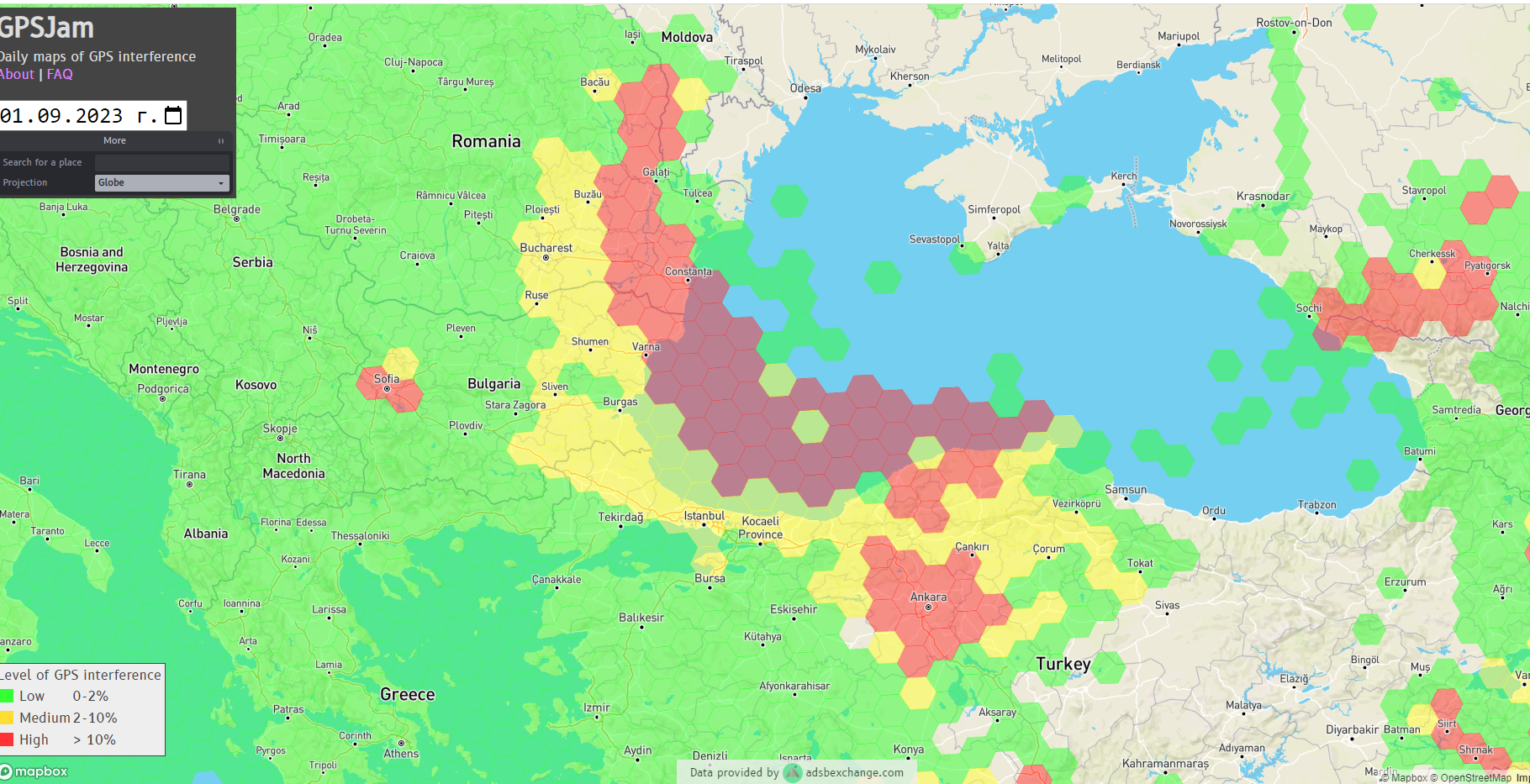 In August, GPS interference over the Bulgarian and Romanian Black Sea coasts appeared to spike, according to data from GPSJAM. The uptick in activity occurred just a month after Russia launched what it described as military exercises in the Black Sea in an area not far from the shores of Bulgaria, which Sofia has designated its Exclusive Economic Zone, a designation that gives a state the right to explore and exploit marine resources.