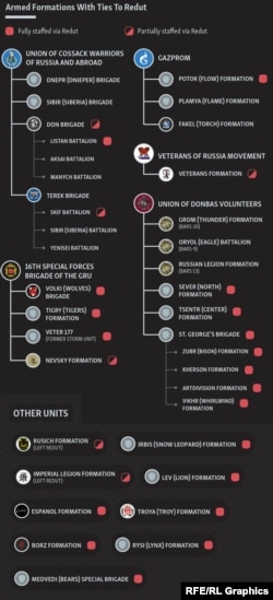 The Wolves are just one of at least 20 formations fighting in Ukraine under the Redut brand, according to an RFE/RL analysis.