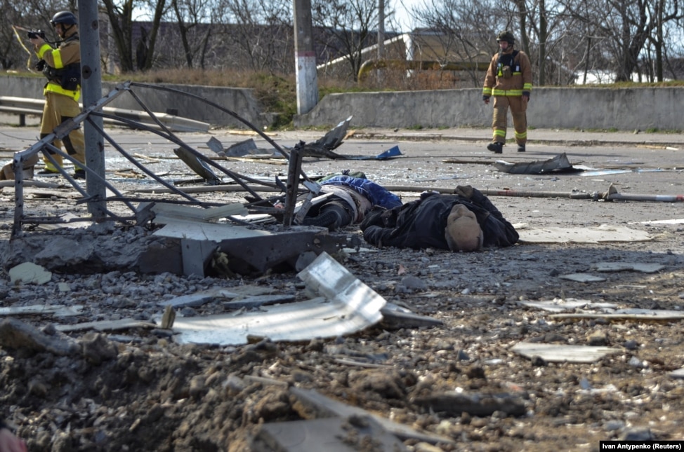 The bodies of people killed by a Russian strike are seen at a public-transport stop in Kherson.