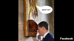 In another, he is shown praying before an Orthodox icon that says to him plainly: “There is no money!”