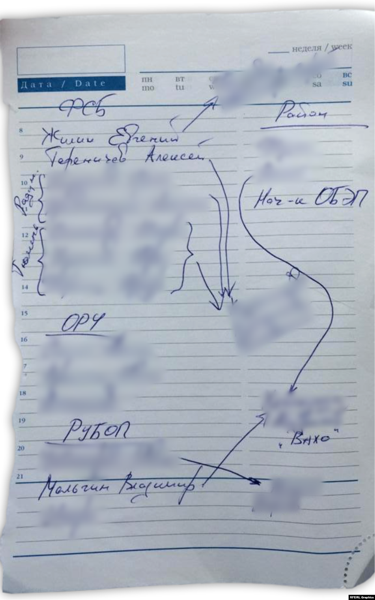 Radio Svoboda was unable to contact Chernakov, who is serving a prison sentence and facing additional oil-theft charges along with another former FSB officer. But the diagram he allegedly wrote includes the names of four individuals that independent sources alleged to Radio Svoboda were involved in oil theft -- among them, two FSB officers.