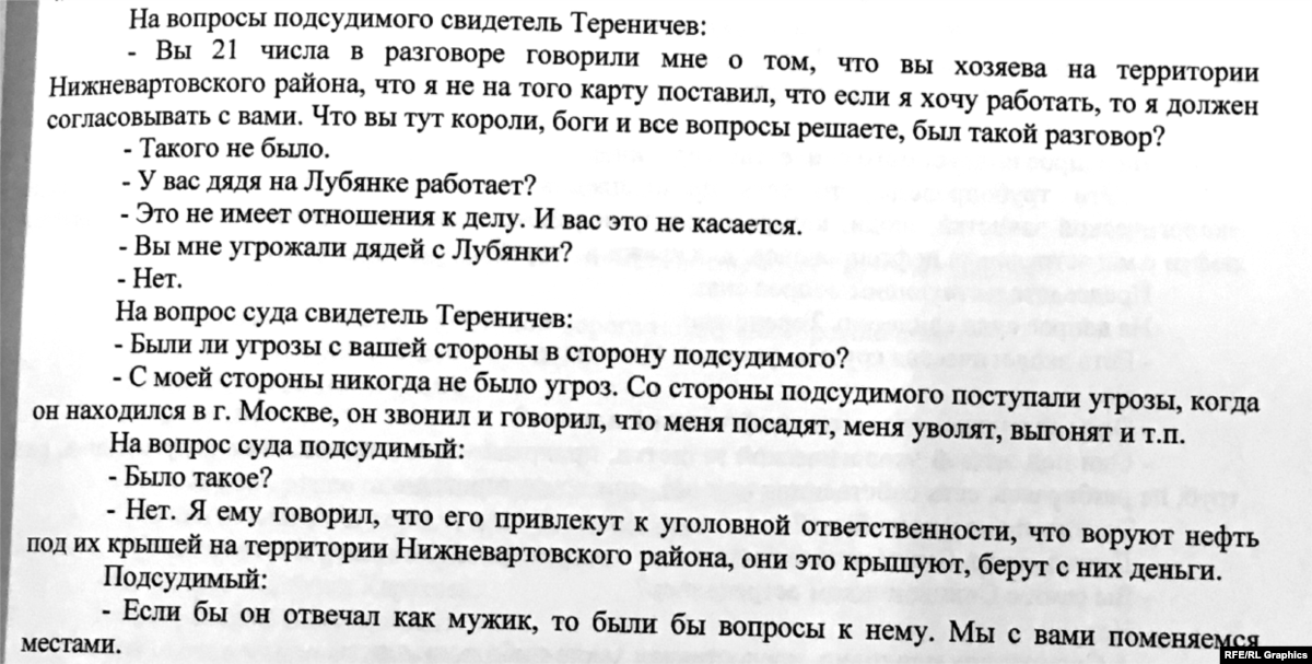 “I told [Terenichev] that he would be convicted for the fact that oil is being stolen under their protection,” Karateyev told the judge, according to court transcripts. Terenichev repeatedly denied Karateyev’s accusations of wrongdoing, the transcripts show.