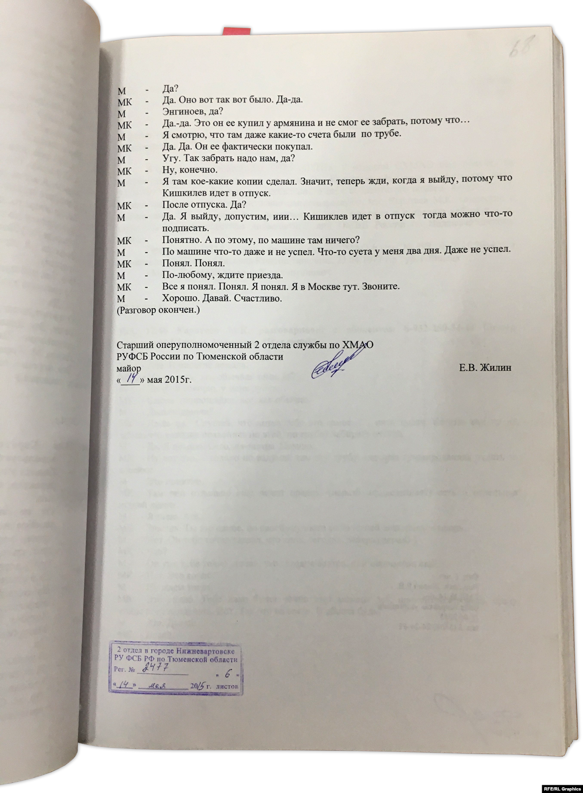 Court documents from Karateyev’s criminal case reviewed by Radio Svoboda include a transcript of a conversation between the ecologist’s brother and Zinchenko secretly recorded by the FSB. In the conversion, Zinchenko and another witness in Karateyev’s case discuss bribe money that Milayev allegedly received in connection with his release of suspected oil thieves on bail.