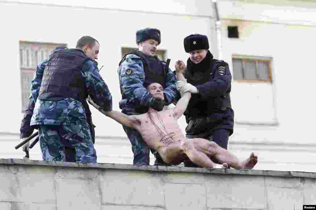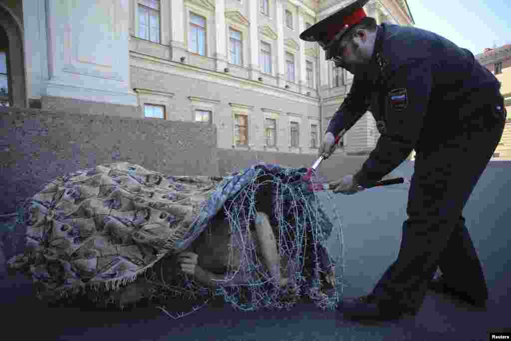 Pavlensky lies on the ground wrapped in barbed wire during a protest action in St. Petersburg in May 2013 to condemn the prosecution of punk collective Pussy Riot.
