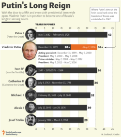 Putin's current term, his second consecutive six-year term, was slated to end in 2024. The previous rules forbid him from running for a third consecutive mandate, but that changes with the provisions of the amendments, meaning he can seek a fifth overall presidential term in 2024, and conceivably a sixth in 2030.
