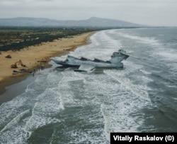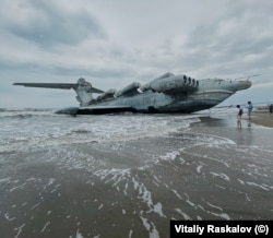On September 28, Egor Berkut made a trip to see the legendary ekranoplan, which he read was in the process of being converted into a museum exhibit, on a beach near the Daghestan town of Derbent. What he saw came as a shock. The professional illustrator told RFE/RL that the vessel was showing obvious signs of damage as it lay in the thumping waves of the Caspian Sea.