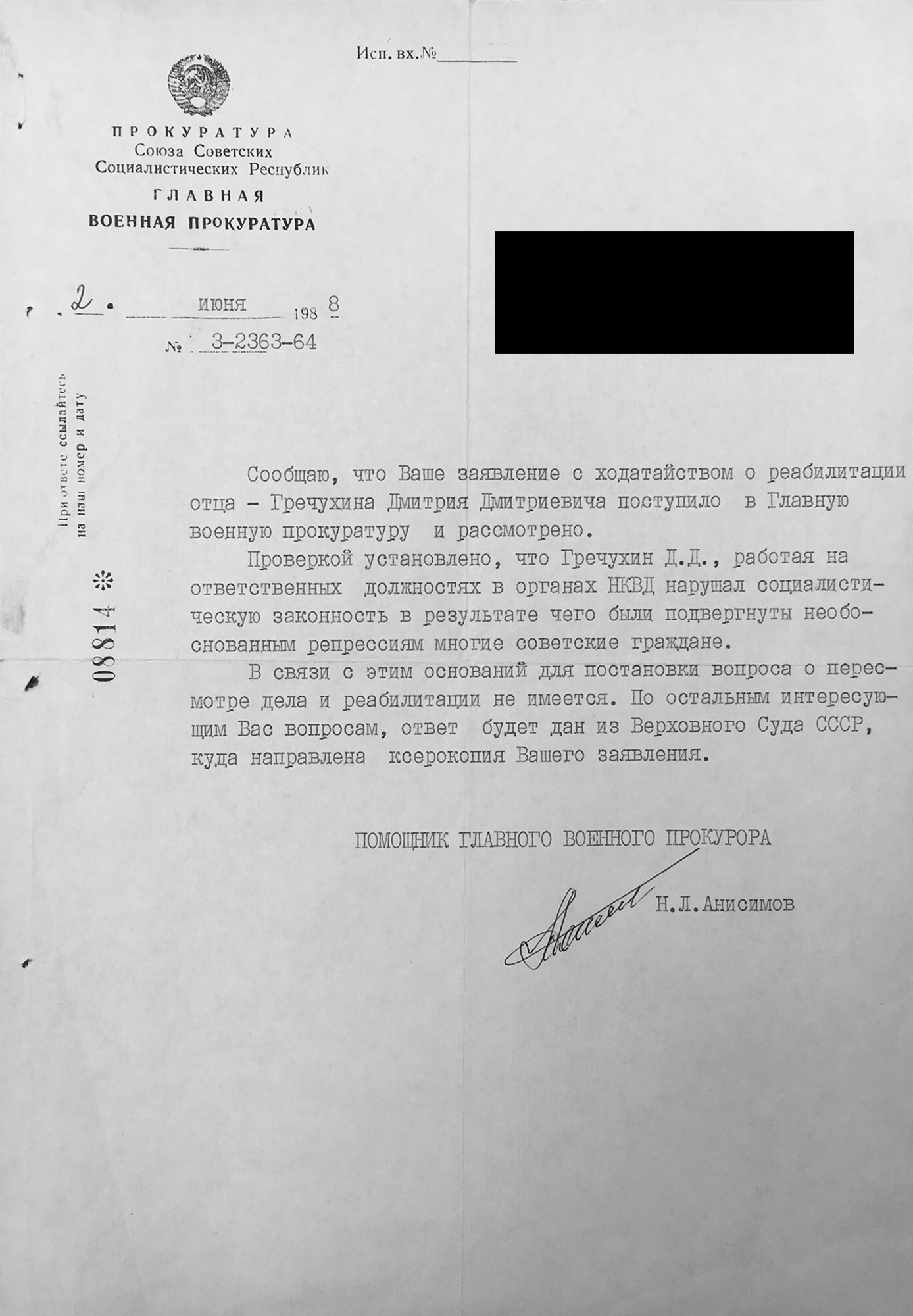 Nearly three decades later, under Nikita Khrushchev's partial de-Stalinization known as The Thaw, an adult Grechukhina wrote to Soviet authorities from her home in Poland to request rehabilitation for her father and information about his fate.