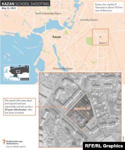 Rustam Minnikhanov, the republic's president, said seven students, a teacher, and another female employee at the school were killed in the attack at School No. 175 on May 11, calling the crime "an enormous tragedy for our republic, for our country."