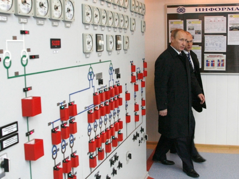 Russian Prime Minister Vladimir Putin (left) and Rosatom Director-General Sergei Kiriyenko visit the Volgodonsk nuclear power plant in southern Russia in March 2010.