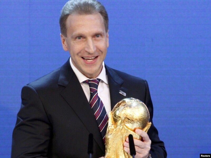 Russian Deputy Prime Minister Igor Shuvalov proudly holds a replica of the World Cup after the announcement in Zurich that Russia is going to be host nation in 2018.