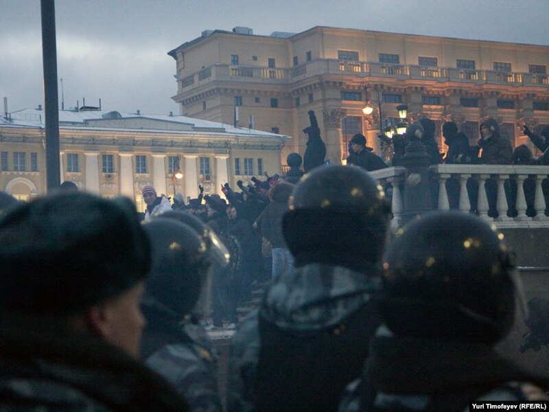 The December 11 violence came just days after another rally during which some 1,000 soccer fans blocked a busy Moscow highway, clambered onto cars, and lit flares. Police responded slowly and did not detain anyone.