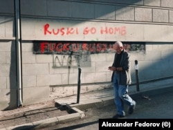The festival came amid openly visible tensions in Tbilisi, where anti-Russian graffiti (pictured) can be seen throughout the city, and a massive influx of Russians fleeing mobilization has exacerbated already skyrocketing rent and property prices.