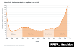 The number of asylum applications by Russian citizens in the United States hit a 24-year high in 2017, jumping nearly 40 percent from the previous year and continuing an upward march that began after Russian President Vladimir Putin returned to the Kremlin in 2012.