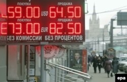 The Russian central bank has urged Russians to remain calm, saying there's no way the euro and the dollar can go higher than 99 rubles -- after all, the currency-exchange signs can't go higher than two digits!