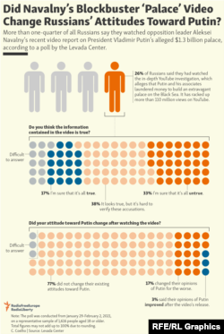 A poll by the independent Levada Center found that more than one-quarter of Russians had seen the film, but most of the poll’s respondents -- 77 percent -- who watched or heard of the investigation said their opinions of Putin were unchanged.