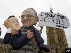 A demonstrator, wearing a Rupert Murdoch head, holds a puppet of British Prime Minister David Cameron in front of Parliament in London on July 13.
