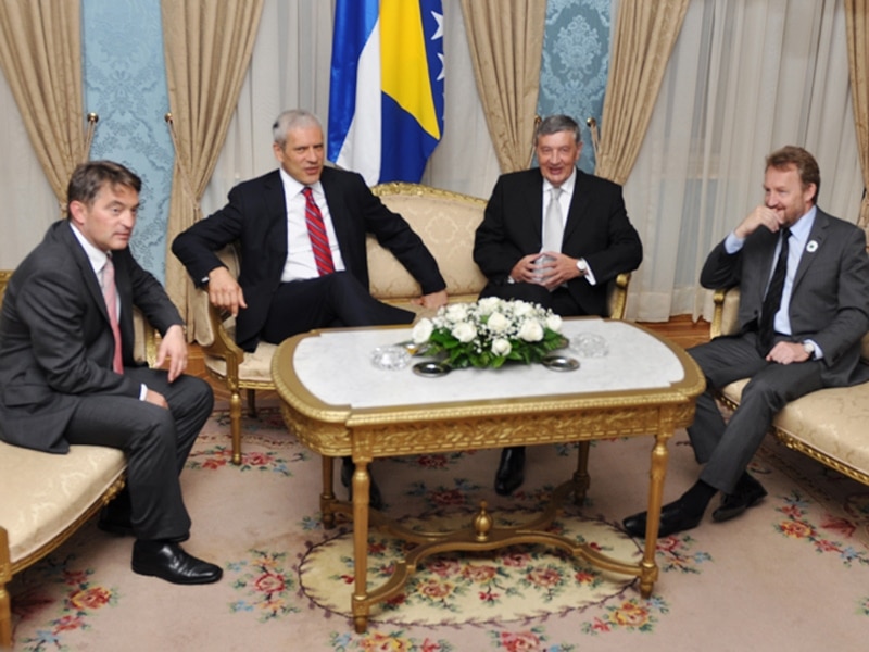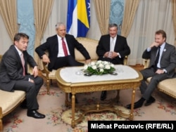 Tadic meets with Bosnia's tripartite Presidency: Zeljko Komsic (left), Nebojsa Radmanovic, and Bakir Izetbegovic(right) in Sarajevo on July 6.
