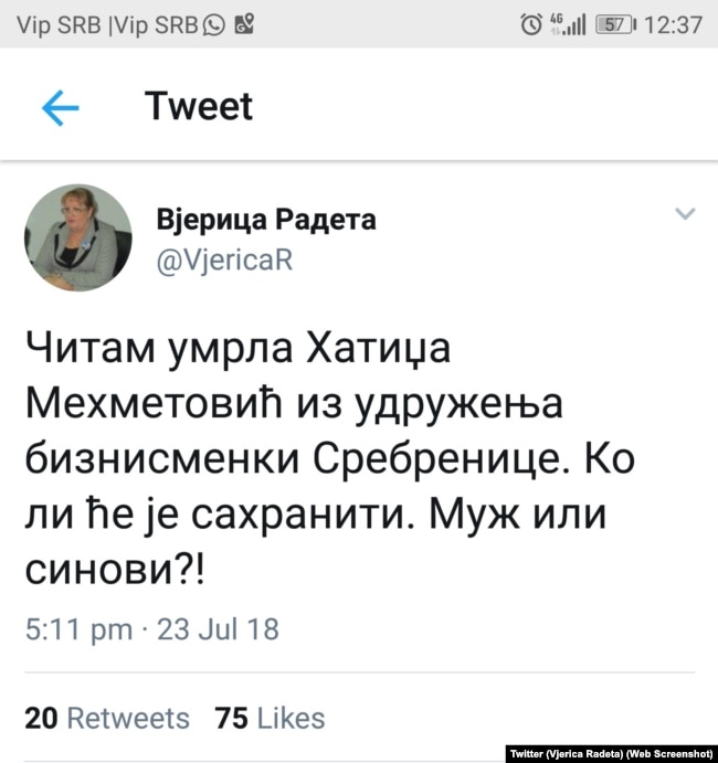 "I've just read that Hatidza Mehmetovic from the 'Businesswomen of Srebrenica' (sic) organization has died," tweeted Radeta, a representative of the Serbian Radical Party led by convicted war criminal Vojislav Seselj.
