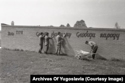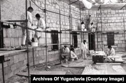Young men put the finishing touches on the Sremski Front memorial in 1988. The memorial complex lies near the border of today's Serbia and Croatia.