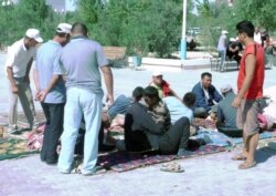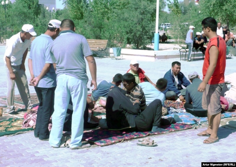 The two men led me toward a green, leafy spot. There are very few trees in Zhanaozen, whose climate is almost desert-like, and the square had no more than a dozen. Under each, oil workers sat on rolled-out carpets, seeking a brief respite from the sweltering heat.