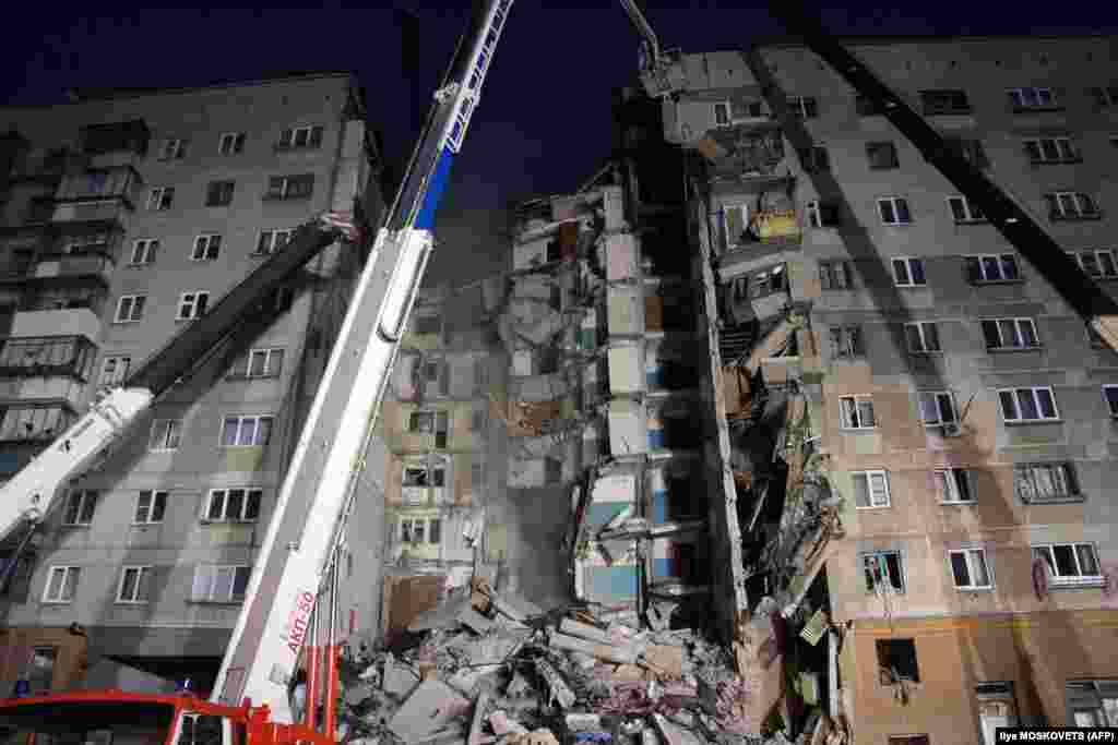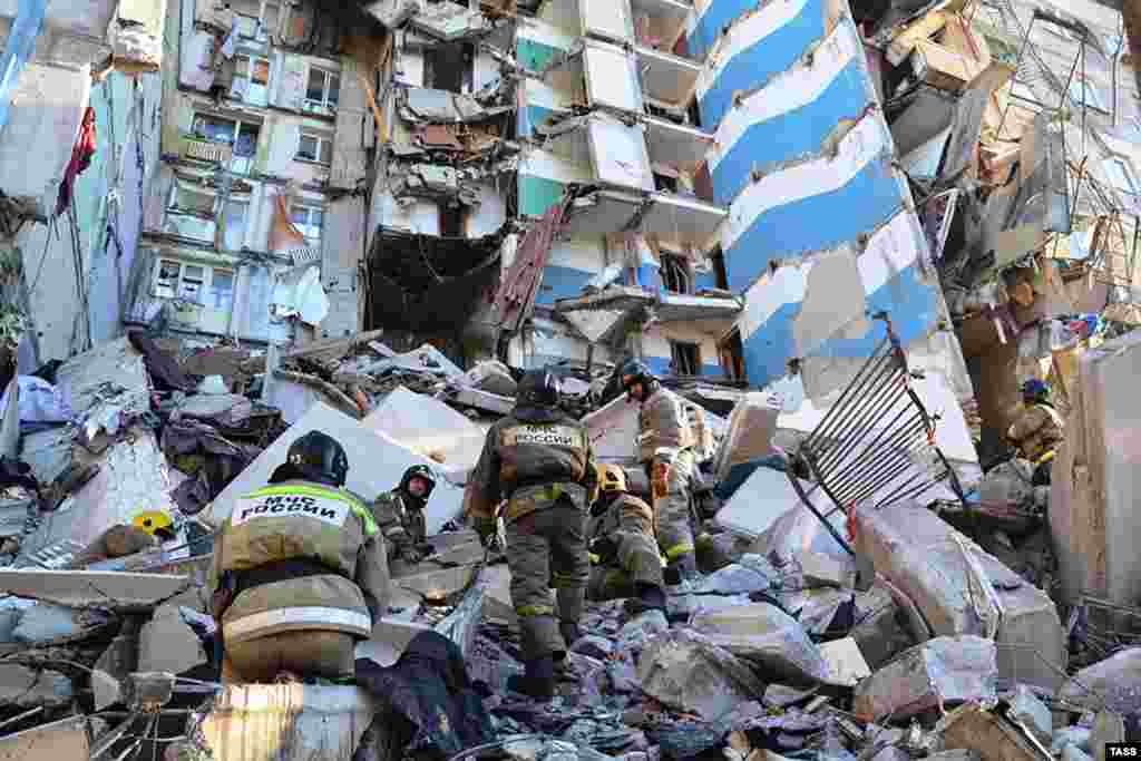 President Vladimir Putin traveled to the city in the southern Urals later on December 31, while rescuers searched through the rubble after almost an entire entryway of the 10-story building came crashing down.