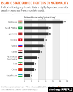 Charlie Winter, the author of the ICCT report, says Tajiks are "disproportionally represented" on the list of suicide bombers -- the number of Tajiks joining IS pales in comparison to that of citizens of some other countries. For example, 6,500 Tunisians and 2,500 Saudis are estimated to have joined IS.