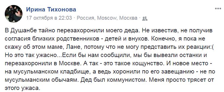 "The remains of my grandfather were secretly buried in Dushanbe. Without informing or getting the consent of the family -- his children and grandchildren." Tikhonova wrote on her Facebook account.
