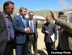Kabiri (second from left) meets with the family of Atovullo Raqibov, whose home was demolished by the Tajik authorities to make way for a reconstruction project.