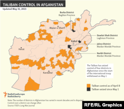 The Afghan government controls the capital, Kabul, provincial capitals, major population centers, and most district centers. The Taliban -- which controls more territory than any other time since the U.S.-led invasion in 2001 toppled it from power -- commands large swaths of the countryside.